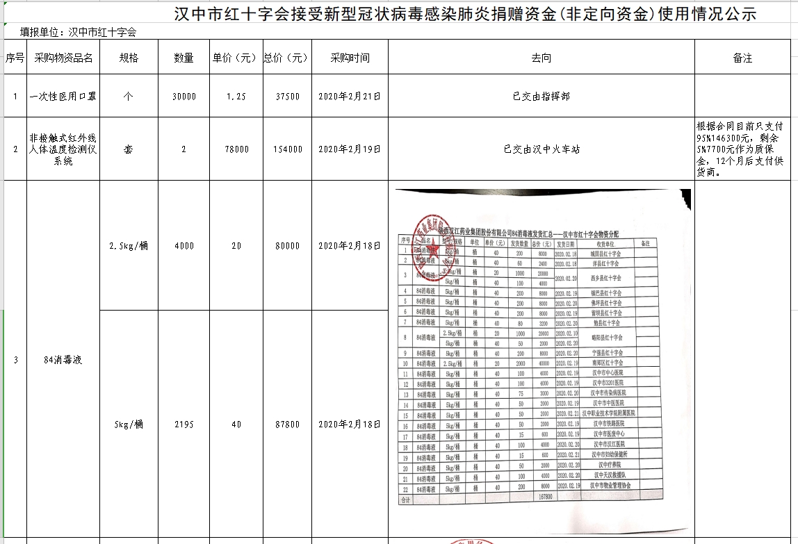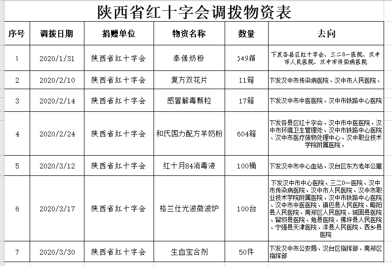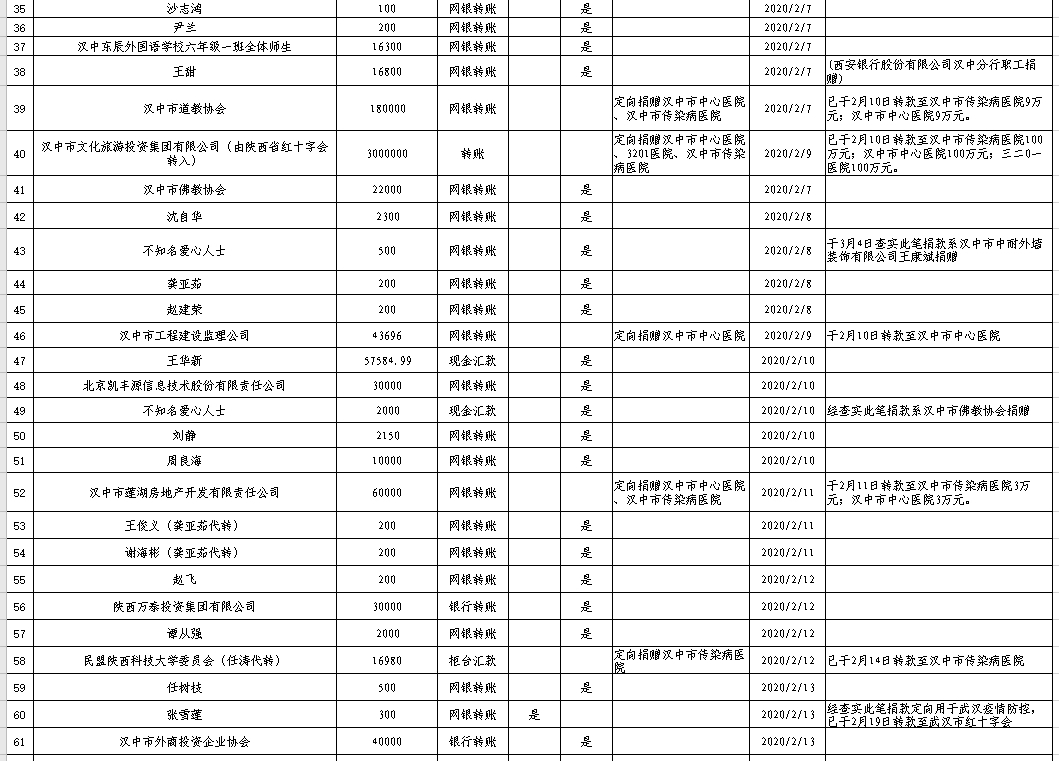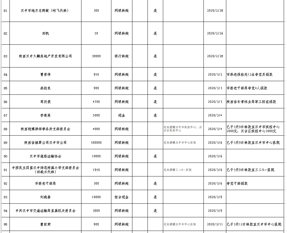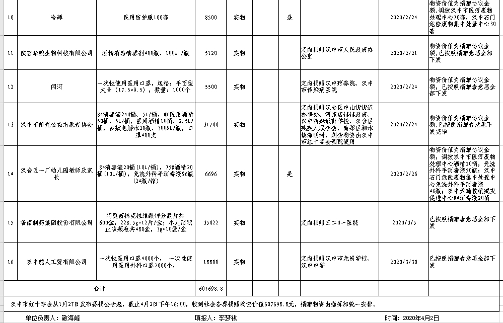 汉中市红十字会接受新型冠状病毒感染肺炎捐款捐物公示